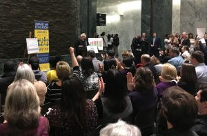 During the lunch hour, a rally was held in the LOB well. Over one thousand supporters from around the state gathered to hear speeches from Assemblywoman Didi Barrett, Chair of the Assembly Library Committee and Senator Patty Ritchie, Chair of the Senate Library Committee, as well as other legislators in full support of restoring (and adding) funding to libraries.