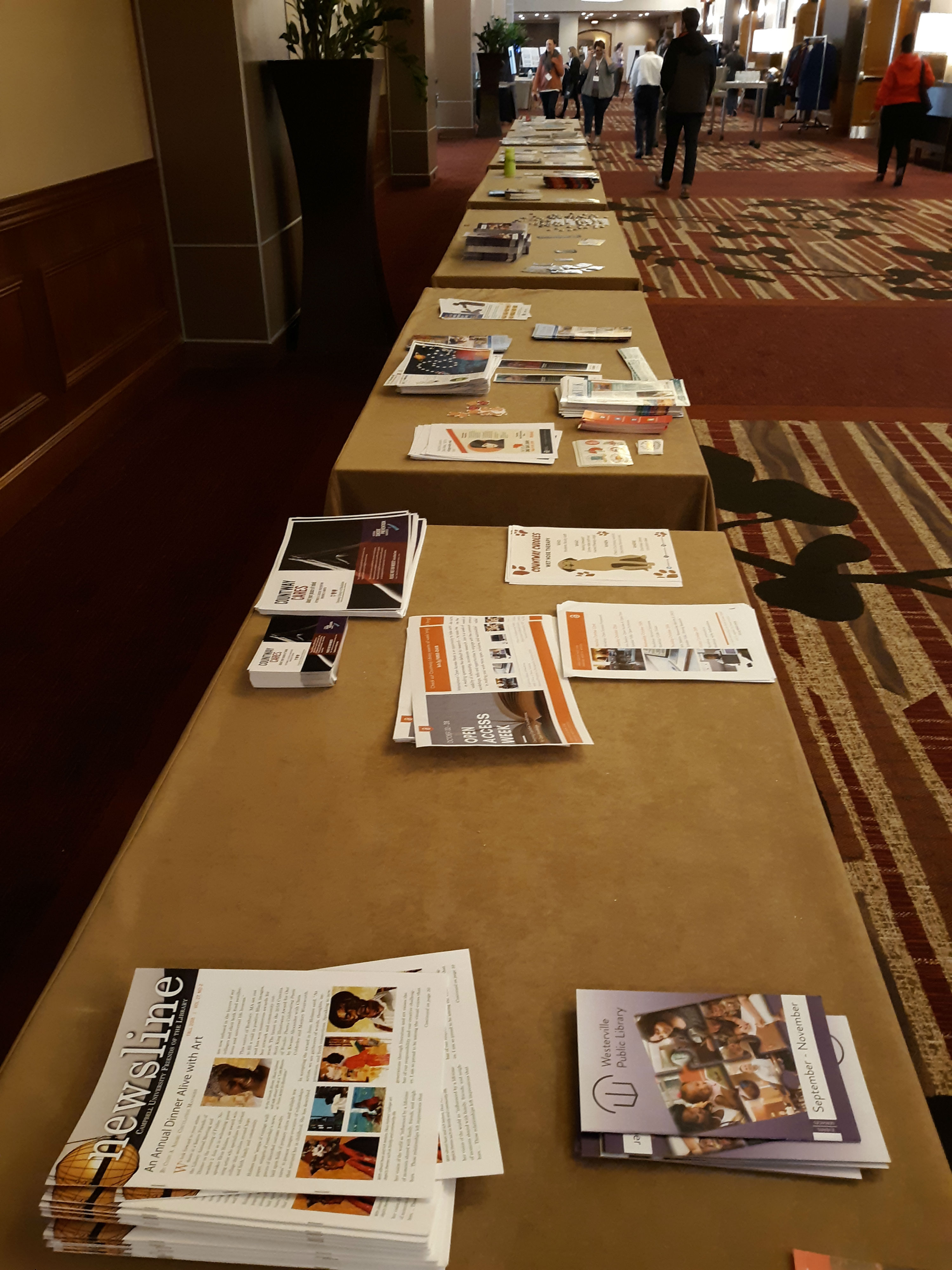 Lunches and dine-arounds afforded me the opportunity to connect with professionals in libraries across the country (and beyond!) who are responsible for marketing, web, design, and social media, and discuss different marketing strategies, things they’ve done that were successful, and challenges they’ve faced. In addition, I was able to collect some excellent samples of different marketing during the conference’s swag swap.