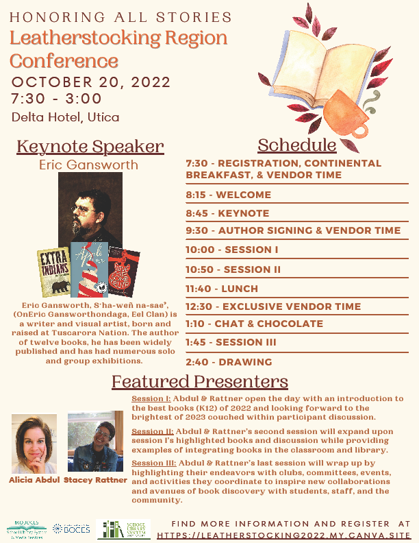We are pleased to share this exciting PD opportunity for school librarians, public librarians, and other educators. The cost to attend is $75; the full conference website can be found here: https://leatherstocking2022.my.canva.site/
