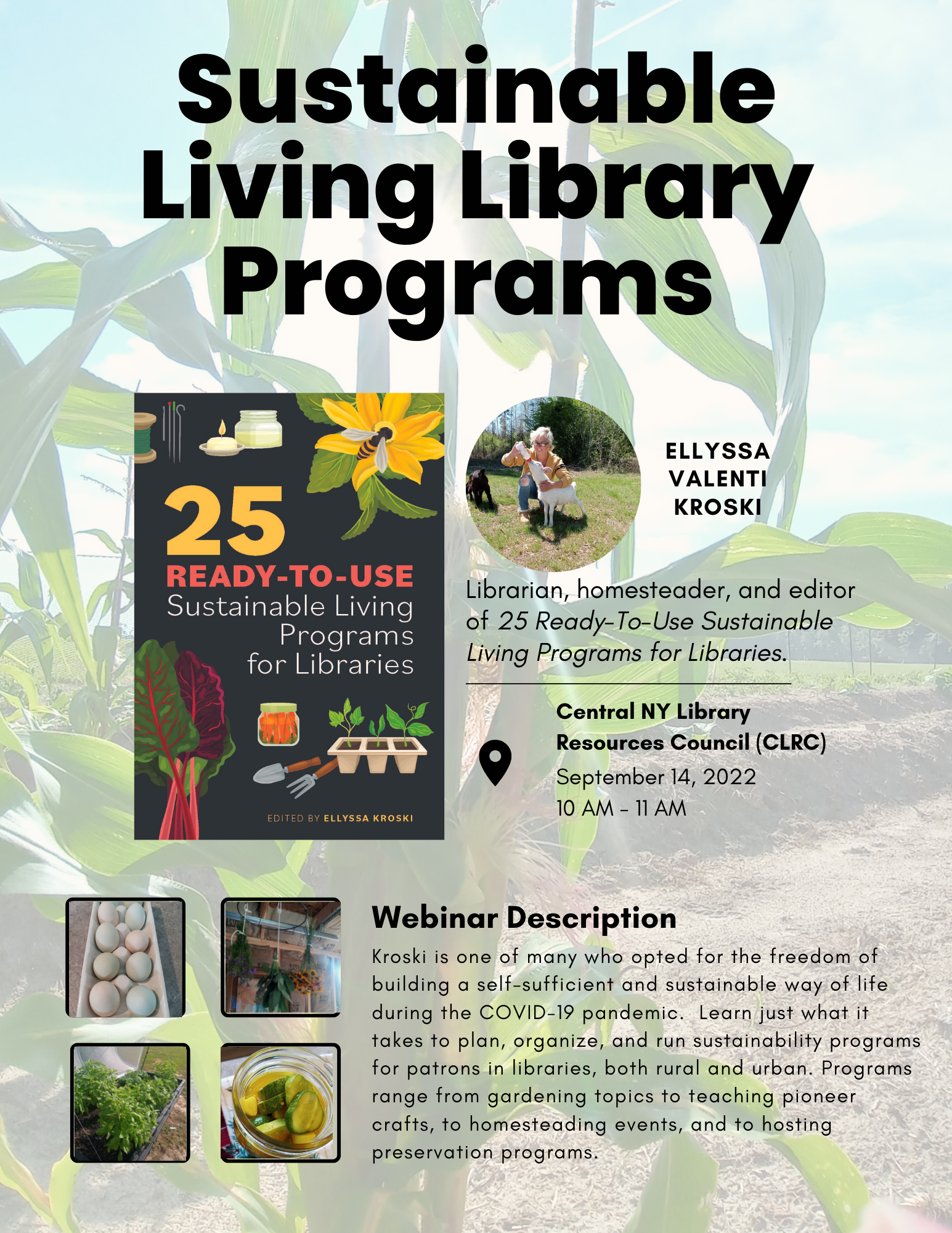 Kroski is one of many who opted for the freedom of building a self-sufficient and sustainable way of life during the COVID-19 pandemic. Learn just what it takes to plan, organize, and run sustainability programs for patrons in libraries, both rural and urban. Programs range from gardening topics to teaching pioneer crafts, to homesteading events, and to hosting preservation programs.